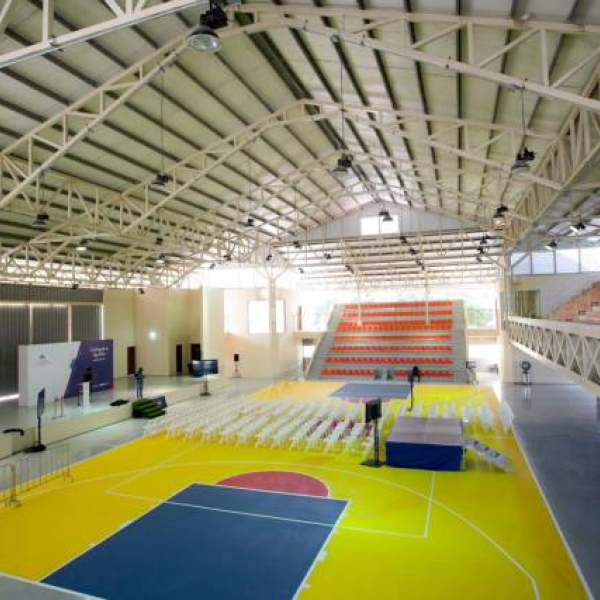 La obra consta de techado, plafón, infraestructura, gradas, cerramientos, pintura general, puertas y ventanas, ductos de aire acondicionado, baños de damas y caballeros e instalaciones eléctricas.